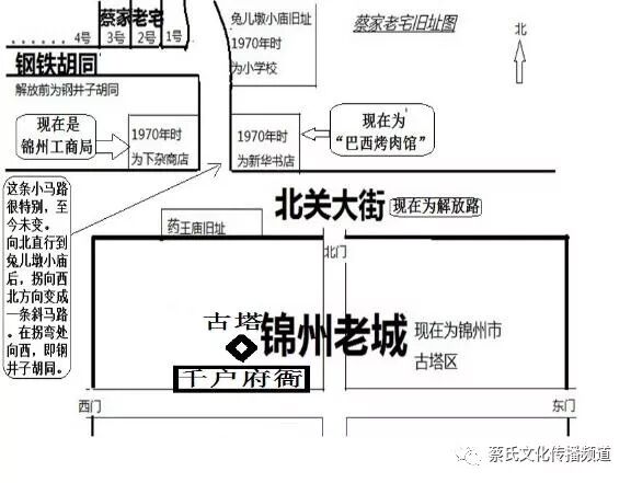 公元1970年,我(27岁)因公出差第一次回到故乡锦州。从东门进入老城,经过东街至古塔下。再从北街走到北门口至北关大街(今解放路)向西。当时锦州老城尚未拆除,在北关大街的老城墙根下,找到药王庙地基的遗址,向北过马路进入路口,路口东北侧是新华书店(今为巴西烤肉馆),1945年时这里是两口灌溉用的大水井;。沿着新华书店与下杂商店之间的小马路直行来到已成为小学校的兔儿墩小庙旧址(今天小学校已无存),小马路在这里拐向西北。由拐弯处再向西行就进入到钢铁胡同(原钢井子胡同),在路北侧见到蔡家大院的2号及3号院老宅。起脊大门楼尚在,但门两侧的石狮子石鼓已荡然无存,大门已换。随后我进入3号大院,院内住户很多,均是解放后迁来的新户。葡萄架和青石板地面还在,院内地面已下窖。非常遗憾的是当时没有带相机,没能留下大院最后时光的照片。伴随锦州的城市改造,老城及城墙均已扒掉,北关大街扩宽为现在的解放路。“蔡家大院”已完全彻底拆除,原地盖起了楼房,底楼已经变成为商业店铺。