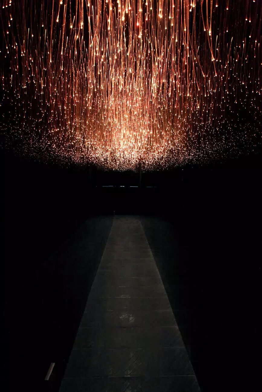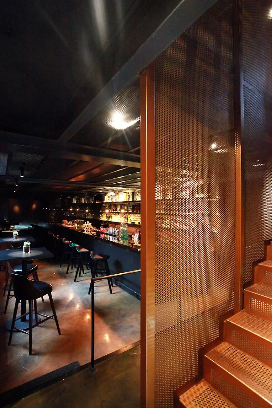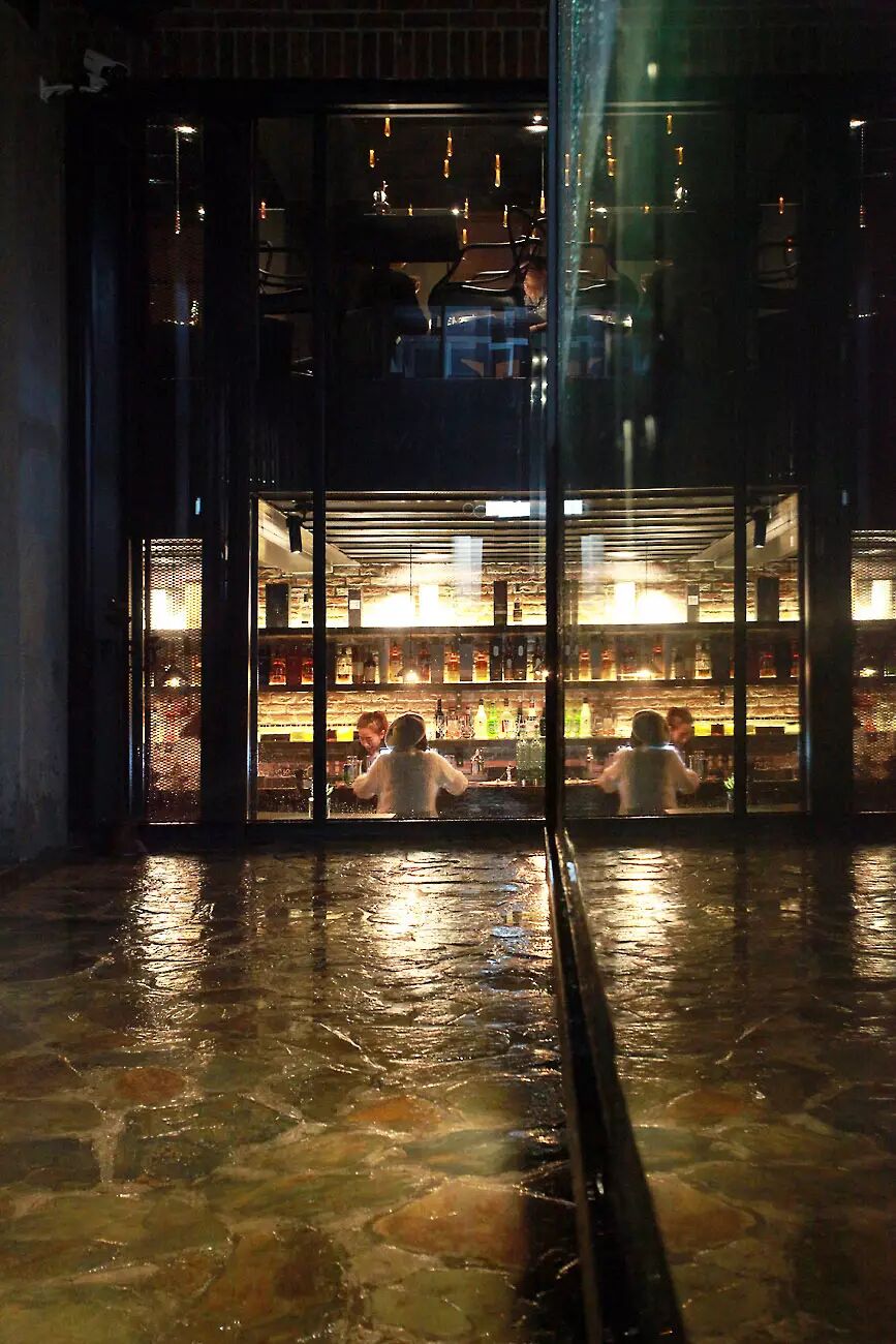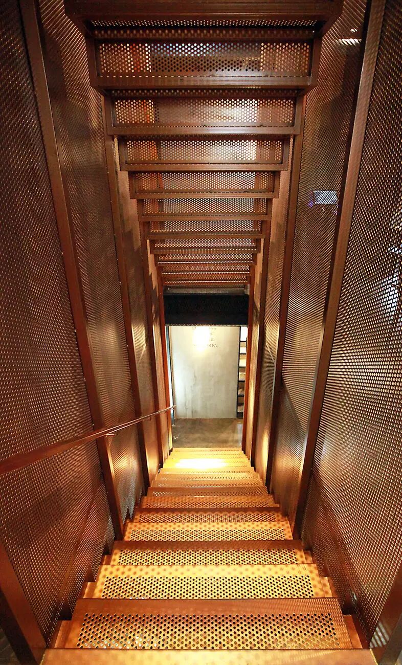 设计师刻意保留了二层建筑临街一侧的原始外立面外观,不给周围环境施压,追求大隐隐于市的感觉。主入口很隐蔽,只有一块小小的logo牌,稍有不慎就会错过,这是给食客第一重心理暗示,这会是一场不同寻常的探寻体验。其次,玄关设计为一个封闭的铁盒子,如何进入成为食客需要解决的第二个问题。第三,每个入口的选择都会带来之后不一样的体验。通向酒吧区的狭窄走廊,由顶部满铺的光纤灯以及两侧可以反射的黑色背漆玻璃组成。灵感来自日本艺术家草间弥生(Yayoi Kusama)的无限境屋(Infinity Mirror Room)和宫崎骏的《风之谷》动画片。每一个进入的人都会有一种走入幻境的别样体验。如果选择了另一条通道,则会进入庭院或茶室。一个空间的出口可能就是另一个空间的入口,一切都在食客的一念之间。