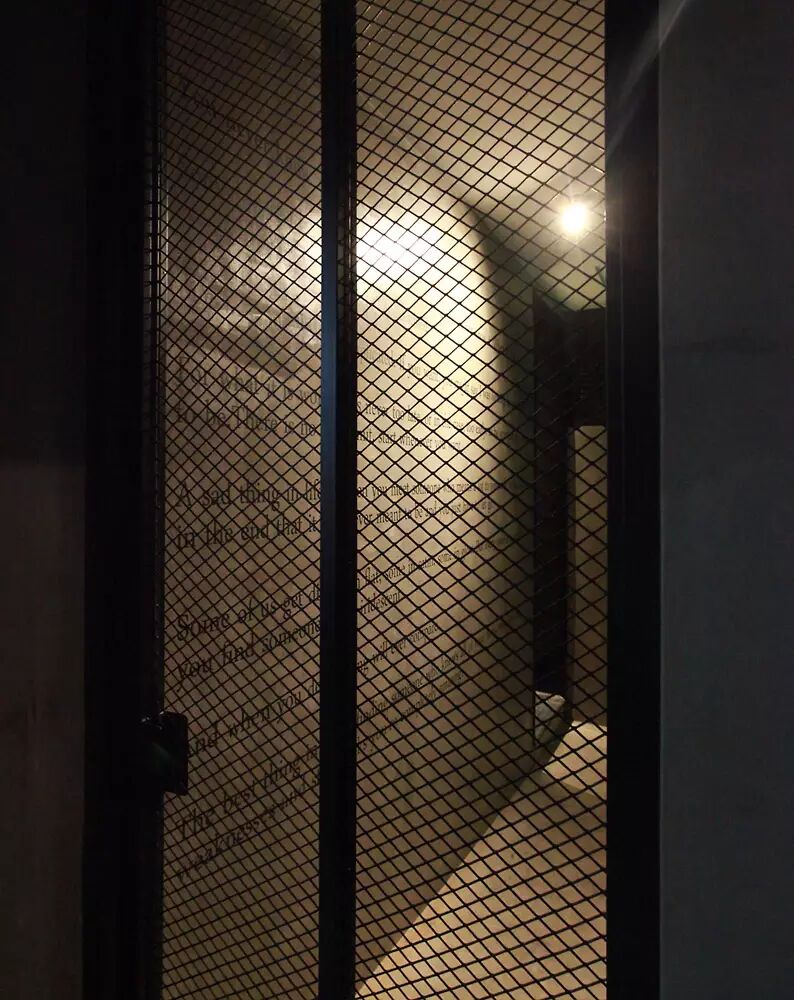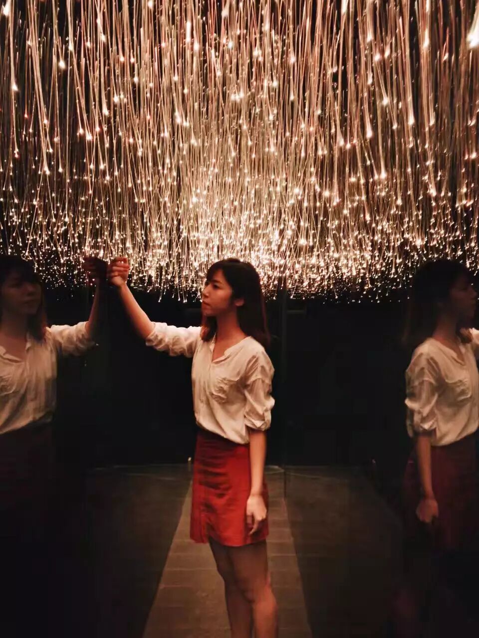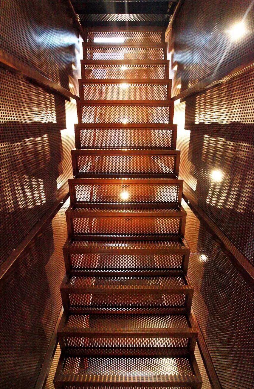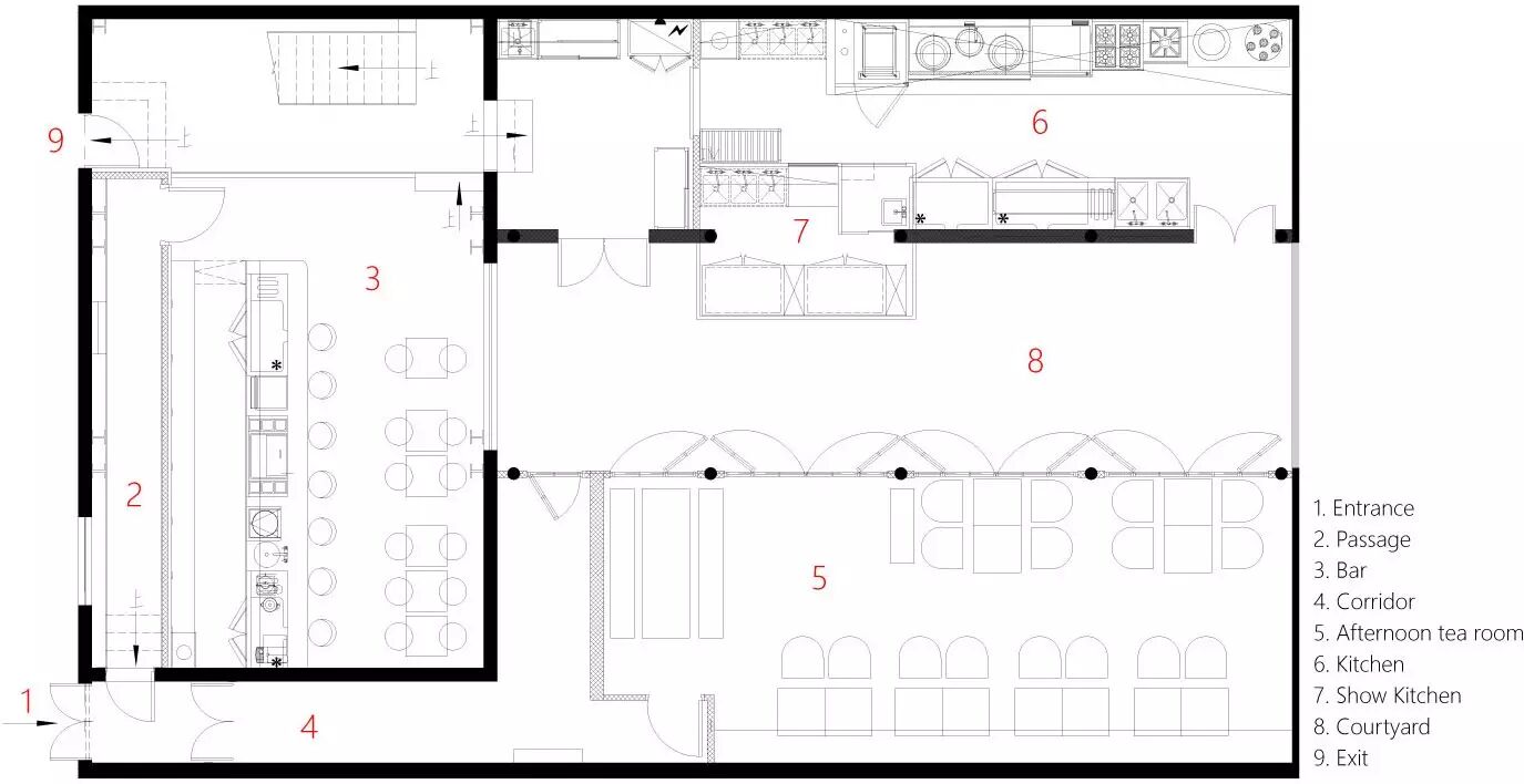 设计师刻意保留了二层建筑临街一侧的原始外立面外观,不给周围环境施压,追求大隐隐于市的感觉。主入口很隐蔽,只有一块小小的logo牌,稍有不慎就会错过,这是给食客第一重心理暗示,这会是一场不同寻常的探寻体验。其次,玄关设计为一个封闭的铁盒子,如何进入成为食客需要解决的第二个问题。第三,每个入口的选择都会带来之后不一样的体验。通向酒吧区的狭窄走廊,由顶部满铺的光纤灯以及两侧可以反射的黑色背漆玻璃组成。灵感来自日本艺术家草间弥生(Yayoi Kusama)的无限境屋(Infinity Mirror Room)和宫崎骏的《风之谷》动画片。每一个进入的人都会有一种走入幻境的别样体验。如果选择了另一条通道,则会进入庭院或茶室。一个空间的出口可能就是另一个空间的入口,一切都在食客的一念之间。