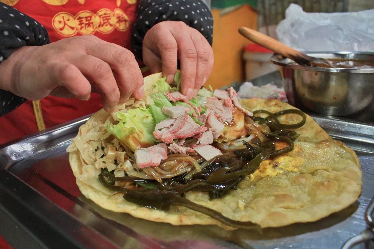 卷上店家特制的小菜,海带丝、豆腐皮、土豆等等,每次老板都会给卷的特别多,荤菜有培根、熏肉、香肠等,大饼的价格根据荤菜的不同而不同,五到十元不等。