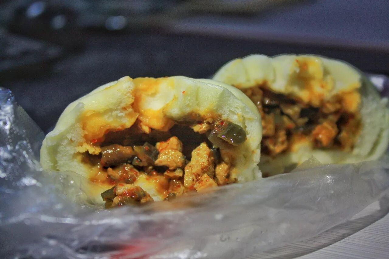 香菇鸡丁包味道偏辣,更像是包子里裹了一道菜,有鸡肉、香菇、还有一些我说不上名字的菜,反正搭配一起味道是非常可口的,建议早上买个蛋黄肉包先解馋,再吃个香菇鸡丁包提提辣味。