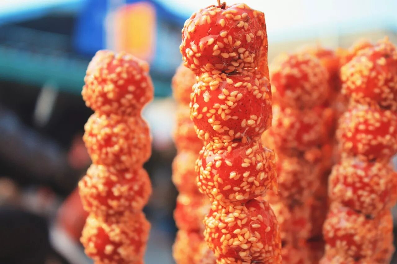 不一会儿,摊子就围满了人,这里糖葫芦都是传统款,没有蔬果类的。对于糖葫芦而言,糖稀是关键,少则酸,多则腻,酸甜适中,恍若人生,那就是宋记糖葫芦了。