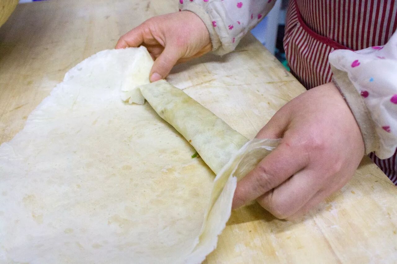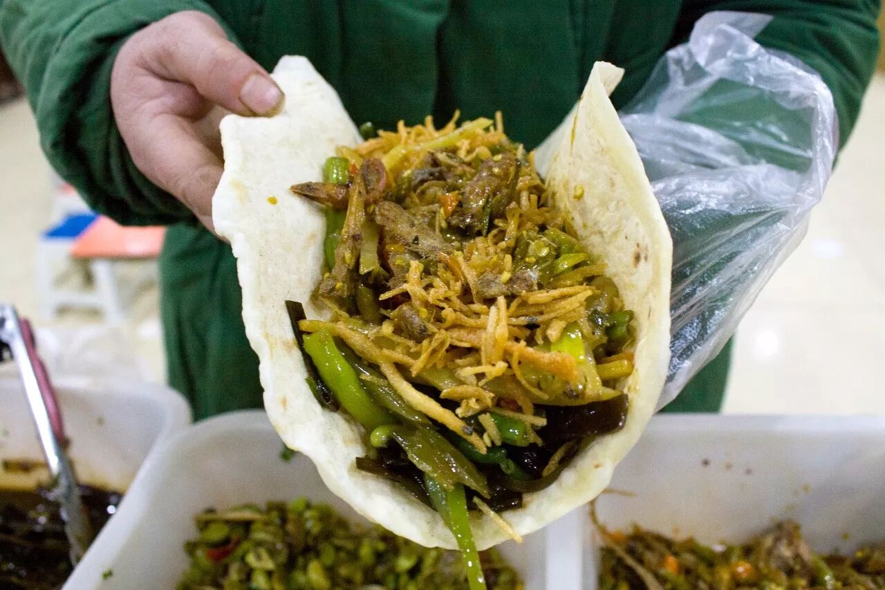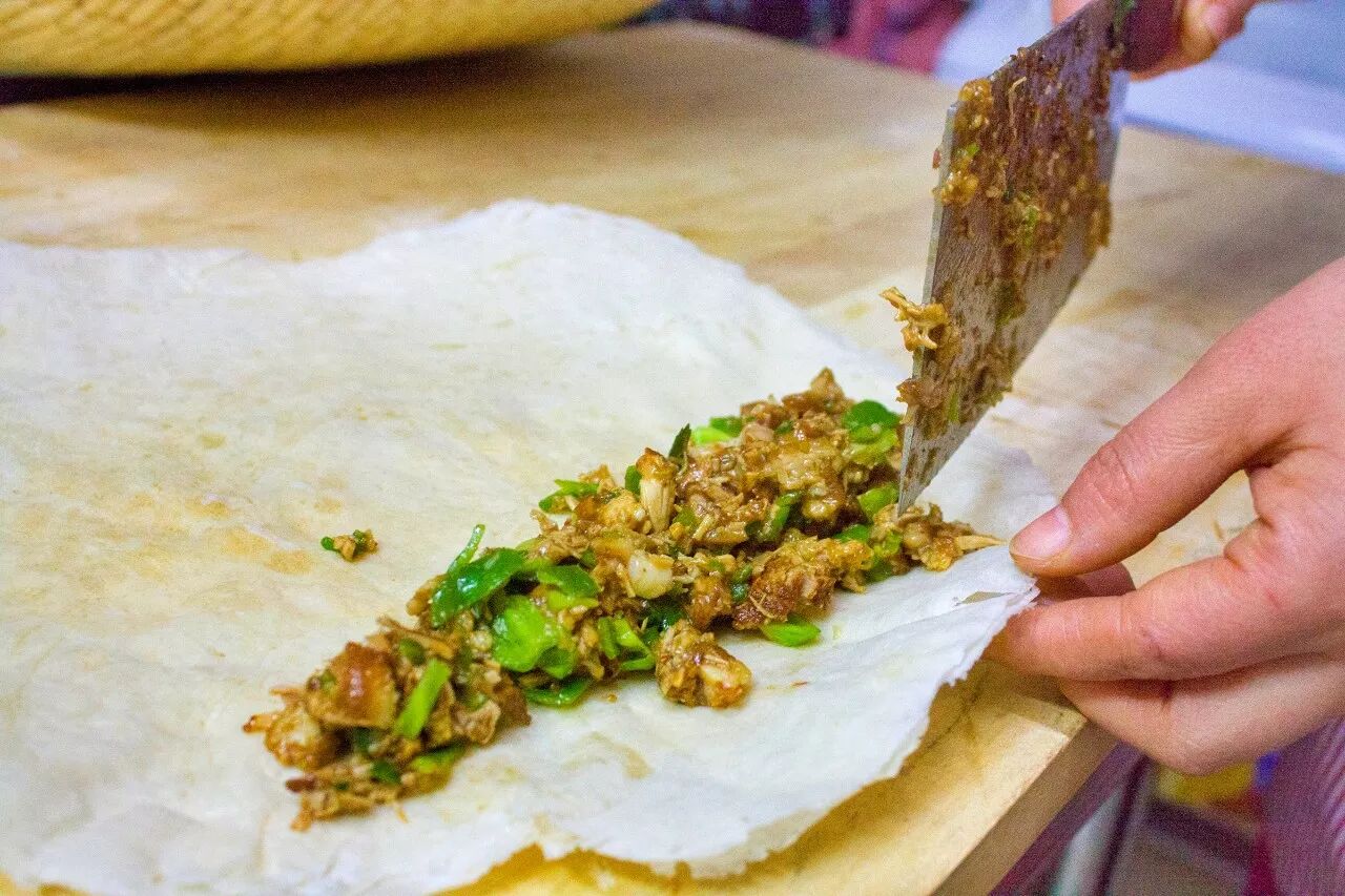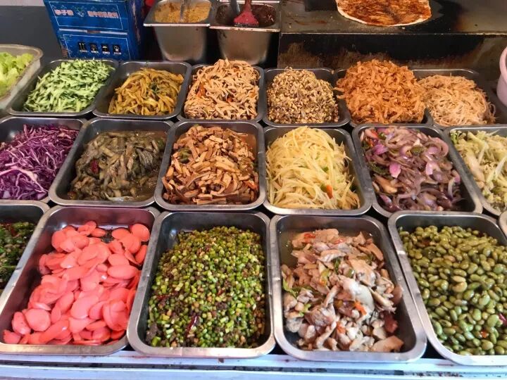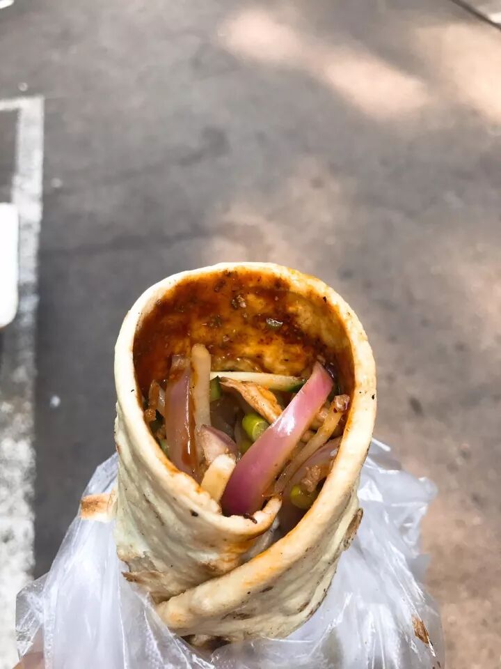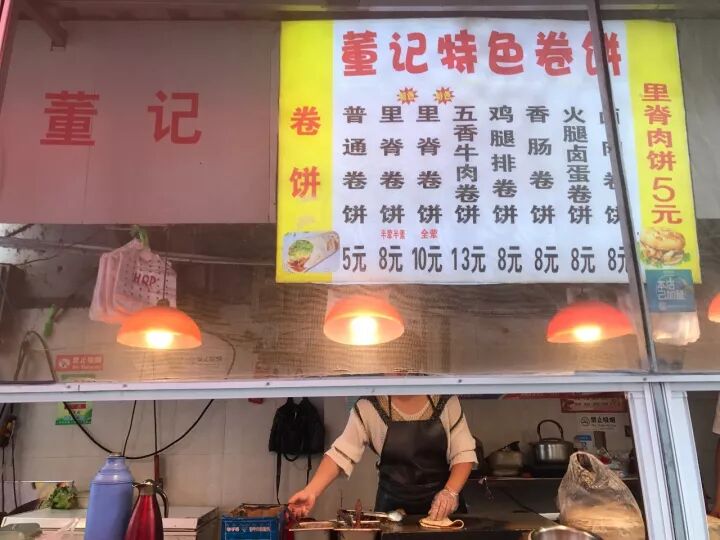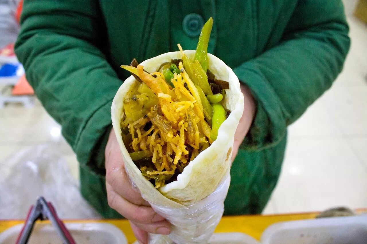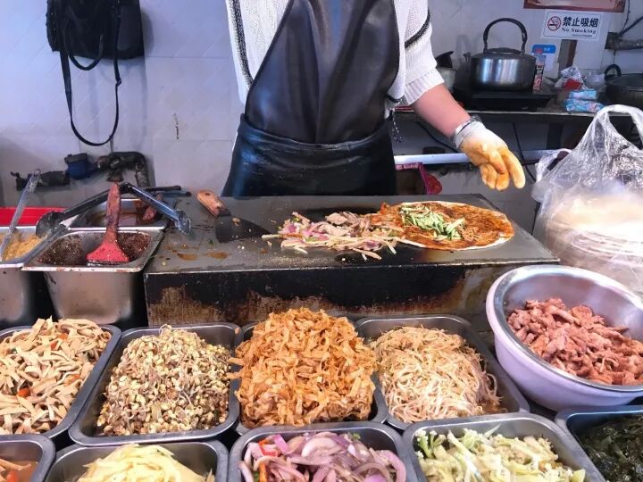 只需五元钱就可以随便卷,虽然还是素菜居多,但也有银鱼这样的荤腥点缀,菜系偏辣,很够味。