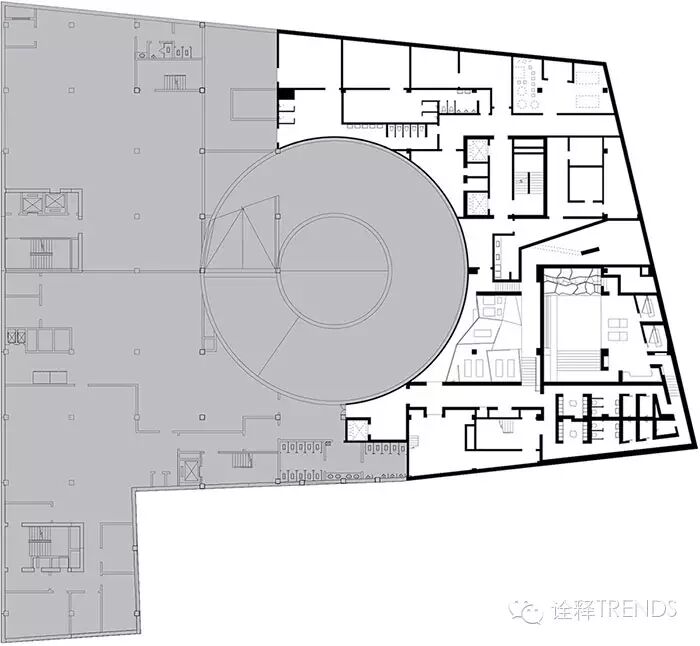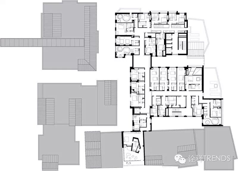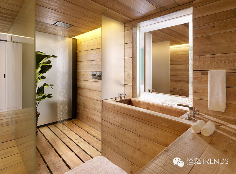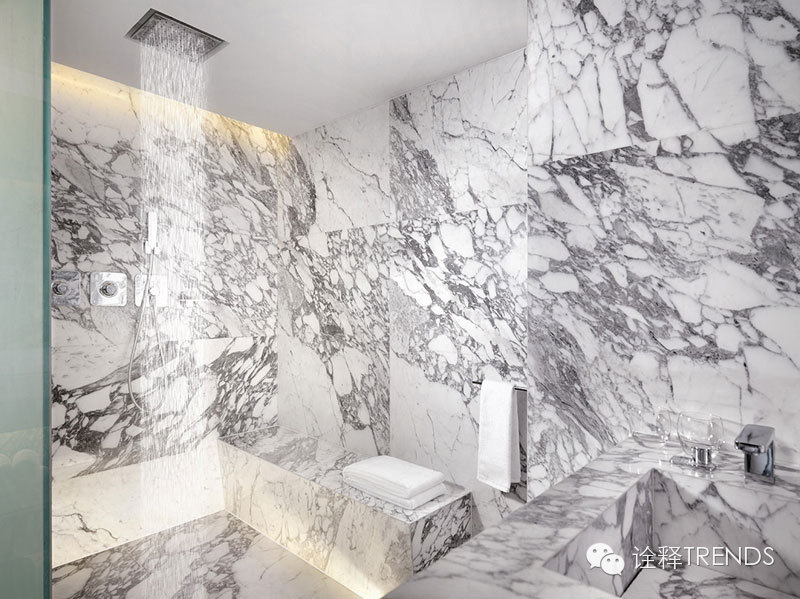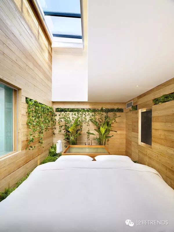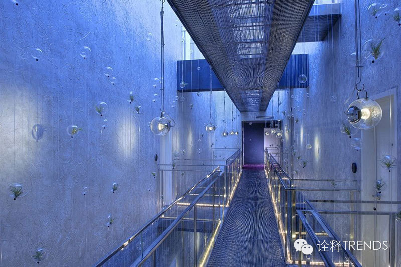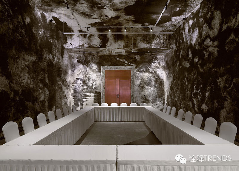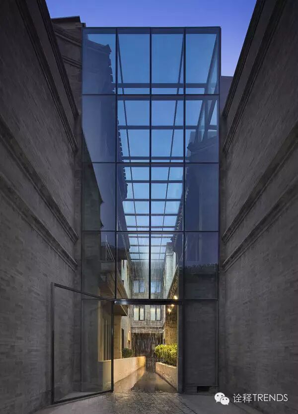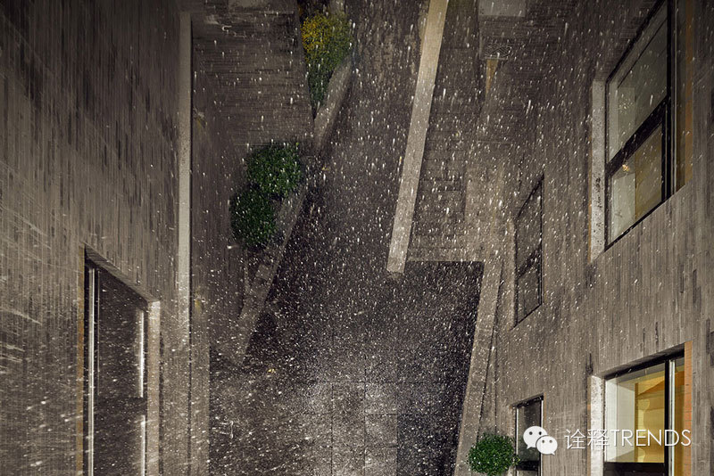 入口处雨巷中,雨幕密集,水声错落,跫音回响,开启水的旅程;南瀑布的细流落在青石瓦上,碎成了点滴,却又汇成了细丝,从屋檐上慢慢流下,在水声中体会静谧;北瀑布更赋予创意和雕琢,悄无声息中滋养悬浮的半空中的绿植,呈现出“润物细无声”的静谧景象;SPA区域的巨型水瀑布将天井和酒店底层水疗浴池连为一体,自然光映衬着水面,构造出“上善若水,连接天地”的独特体验。