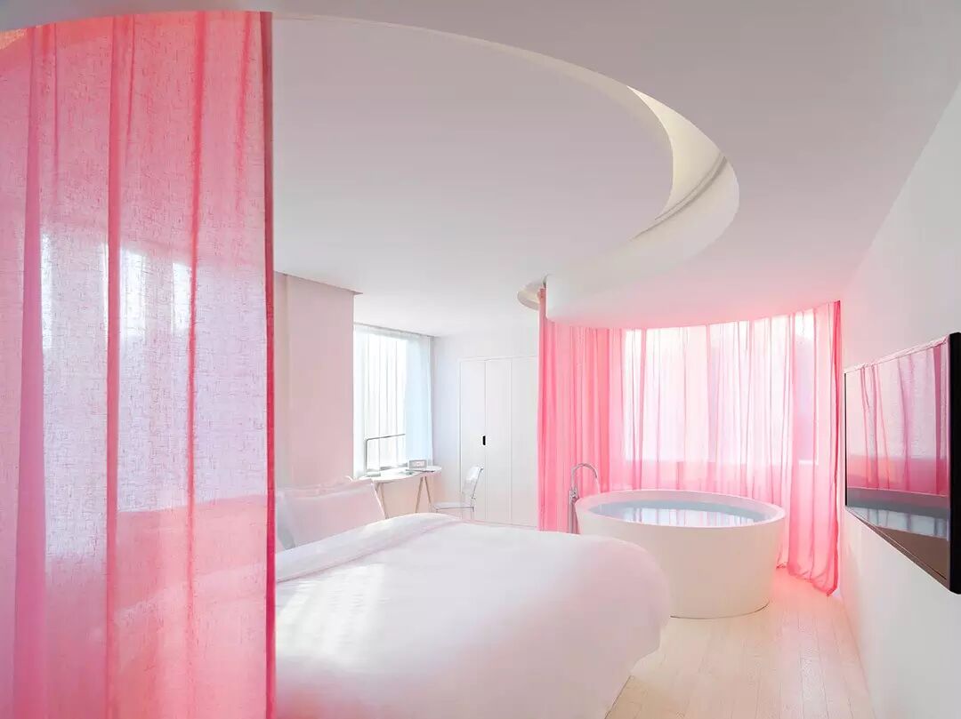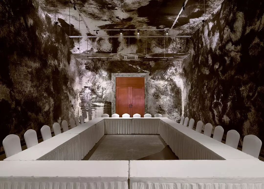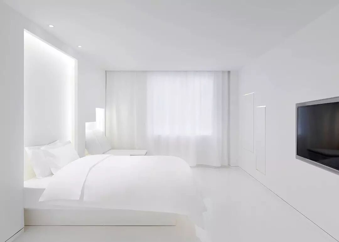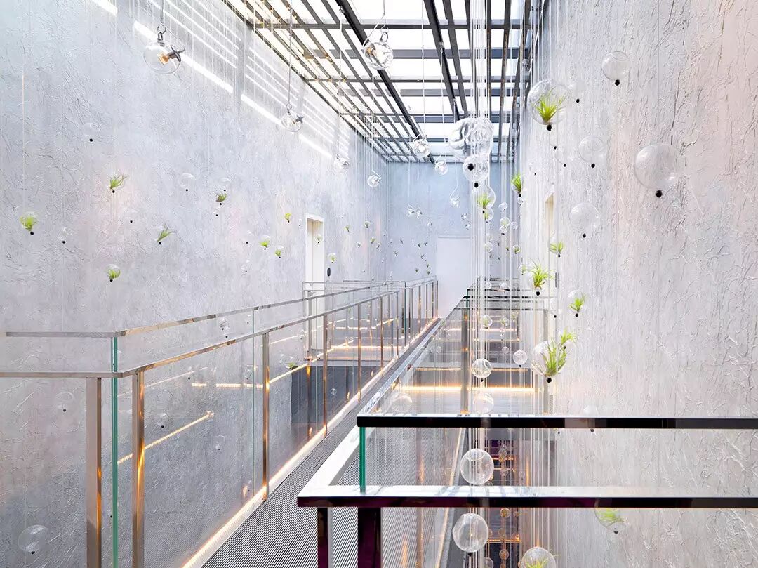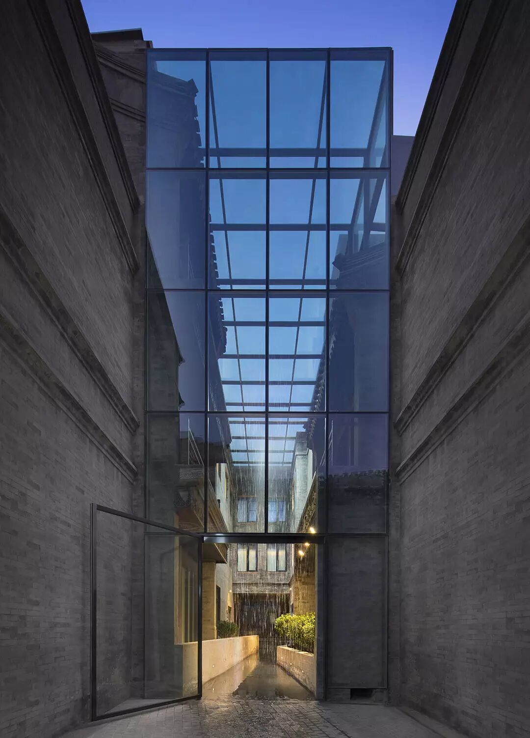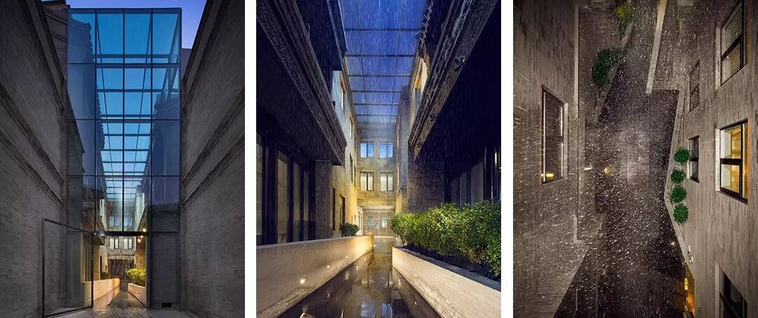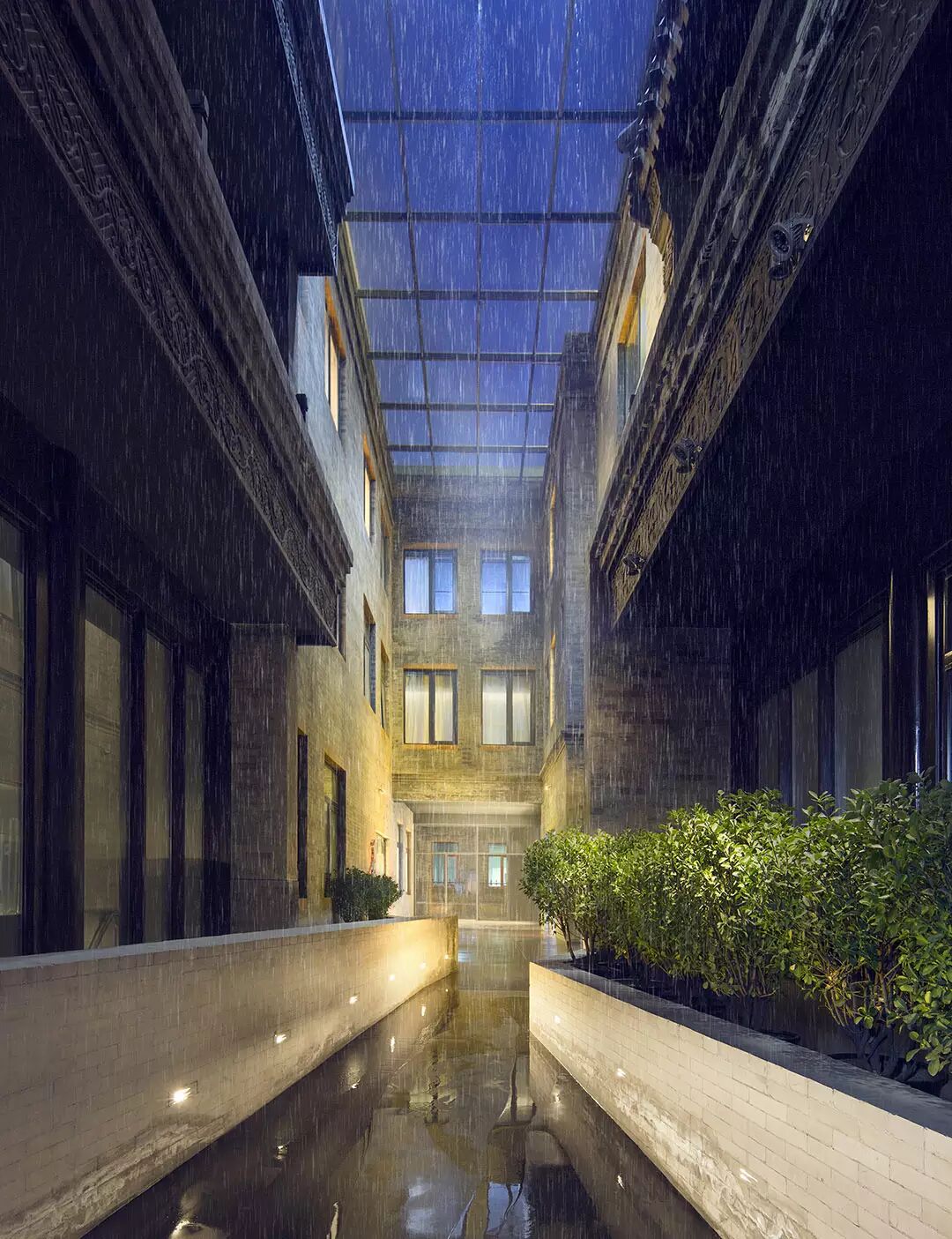 酒店原址为老北京著名的便民浴池兴华园,这里本来就与水有着不解之缘,在美国ASAP设计事务所的打造下,更呈现出一派后现代的冷调与传统人文相结合的冲撞美。大厅在一道水幕之下安静地幽暗着。这道水幕从屋檐而下,沿着一根根细丝慢慢流下来。细丝上悬浮着无土绿植,而它的养殖也正是靠着这个水幕的循环系统来供给。在水主题的统领下,酒店的65间客房均由与水相关的汉字命名,比如"润"、"滋"等,昏暗走廊内每一个房间的旁边都幽幽亮着一个三点水的汉字,还未进房意境就已然润泽起来。有趣之处在于,每个房间内都会有一枚与房间名称相同的印章作为纪念品送给客人,会议室水墨的磅礴感与灵动感,立刻让这件涓涓的精品小酒店变得恢弘起来。