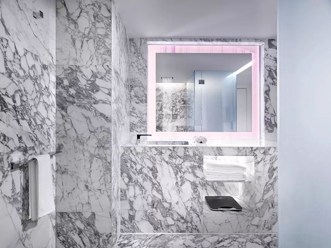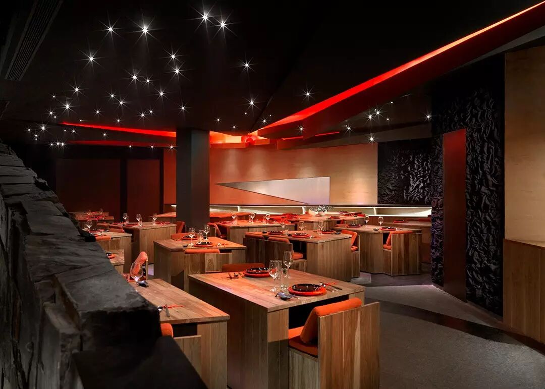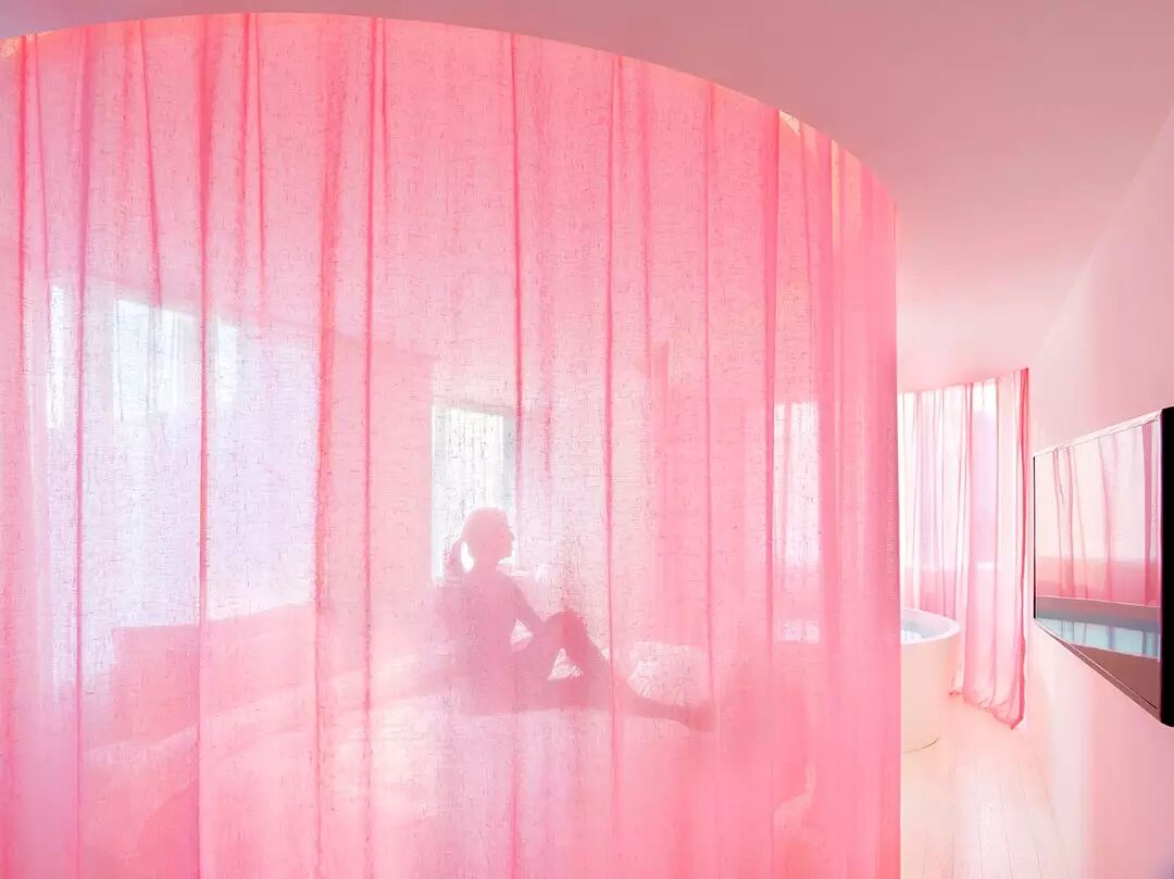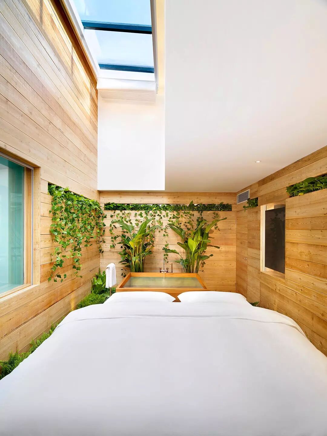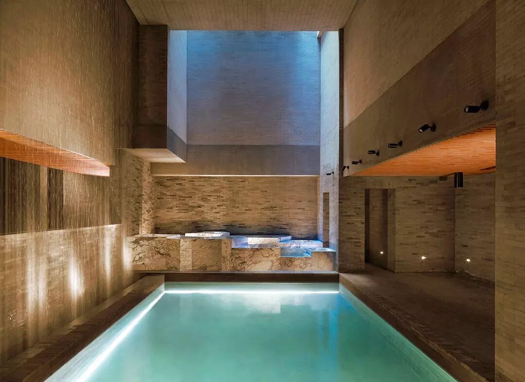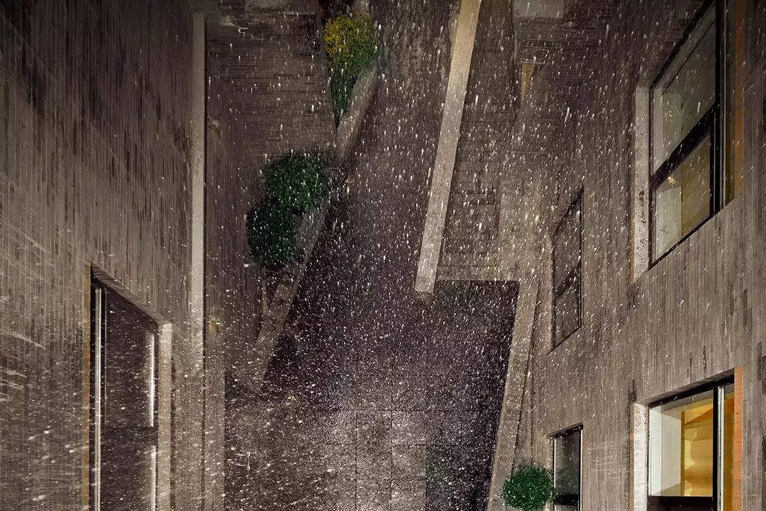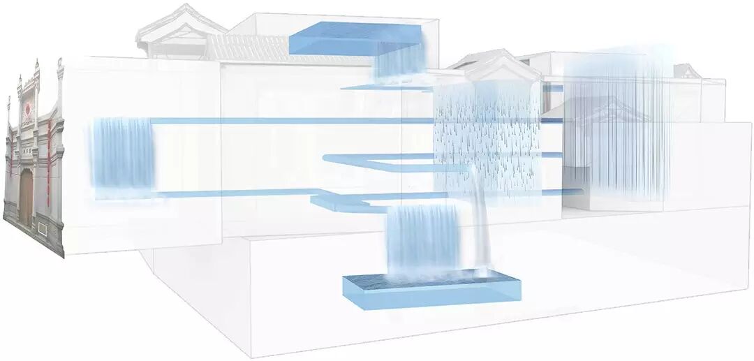 酒店原址为老北京著名的便民浴池兴华园,这里本来就与水有着不解之缘,在美国ASAP设计事务所的打造下,更呈现出一派后现代的冷调与传统人文相结合的冲撞美。大厅在一道水幕之下安静地幽暗着。这道水幕从屋檐而下,沿着一根根细丝慢慢流下来。细丝上悬浮着无土绿植,而它的养殖也正是靠着这个水幕的循环系统来供给。在水主题的统领下,酒店的65间客房均由与水相关的汉字命名,比如"润"、"滋"等,昏暗走廊内每一个房间的旁边都幽幽亮着一个三点水的汉字,还未进房意境就已然润泽起来。有趣之处在于,每个房间内都会有一枚与房间名称相同的印章作为纪念品送给客人,会议室水墨的磅礴感与灵动感,立刻让这件涓涓的精品小酒店变得恢弘起来。