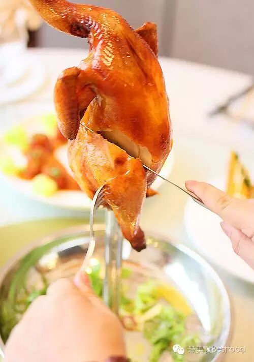 大厨告诉我们想知道这道菜好不好,用刀切一下鸡腿就能体会。听到刀叉碰到外皮的“咔咔”声你就知道有多酥脆,经过烤制肉汁被锁在鸡肉中保证了肉质的鲜美嫩滑不干柴,一刀切下去汁水四溢。和老北京烤肉一样,吊烧鸡也分文吃和武吃,喜欢自己动手的,可以武吃;也可以请店员切好,自己慢慢享用,这是文吃。